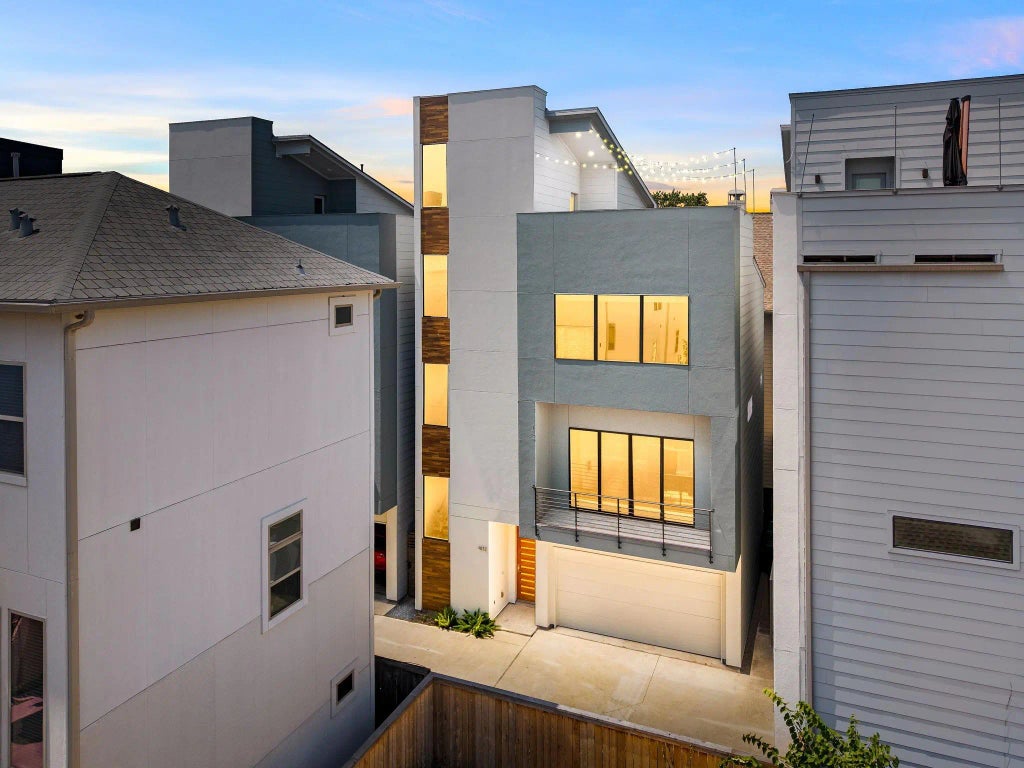 Experience modern luxury in the heart of Rice Military. This contemporary home showcases soaring ceilings, expansive windows, and light-filled living spaces designed for both comfort and entertaining. The chef’s kitchen is anchored by a striking waterfall marble island and sleek modern fixtures, opening seamlessly to the main living and dining areas. Upstairs, the primary suite offers a spa-inspired retreat with a soaking tub, oversized shower, and walk-in custom closet. The highlight is the 4th-story terrace with panoramic downtown views — the perfect backdrop for morning coffee or evening gatherings. Zoned to Memorial High School, this home blends style, function, and location in one exceptional package. No HOA!