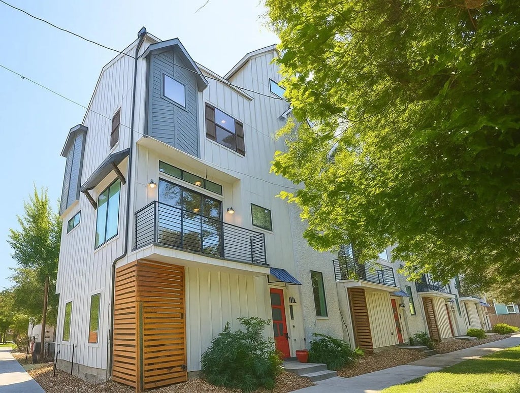 Minutes from downtown Houston, this stylish home blends contemporary design with farmhouse charm, creating a warm retreat in the city. Sunlight pours through expansive windows, highlighting tall ceilings, hardwood floor and elegant finishes. The first floor features a private guest suite with full bath and an attached two-car garage. Upstairs, an open living, dining, and chef’s kitchen with quartz counters, large island, gas cooktop, and ample space to make entertaining effortless. A balcony overlooks rare green space—perfect for grilling or morning coffee. The third floor offers a serene primary retreat with spa-like bath, plus a second en-suite bedroom. At the top, a loft or office opens to a terrace with skyline views, while a rooftop deck invites relaxing or entertaining. Nestled in Houston’s vibrant Arts District and just minutes from the Heights, you’re surrounded by galleries, coffee shops, breweries, restaurants, shopping malls and more.