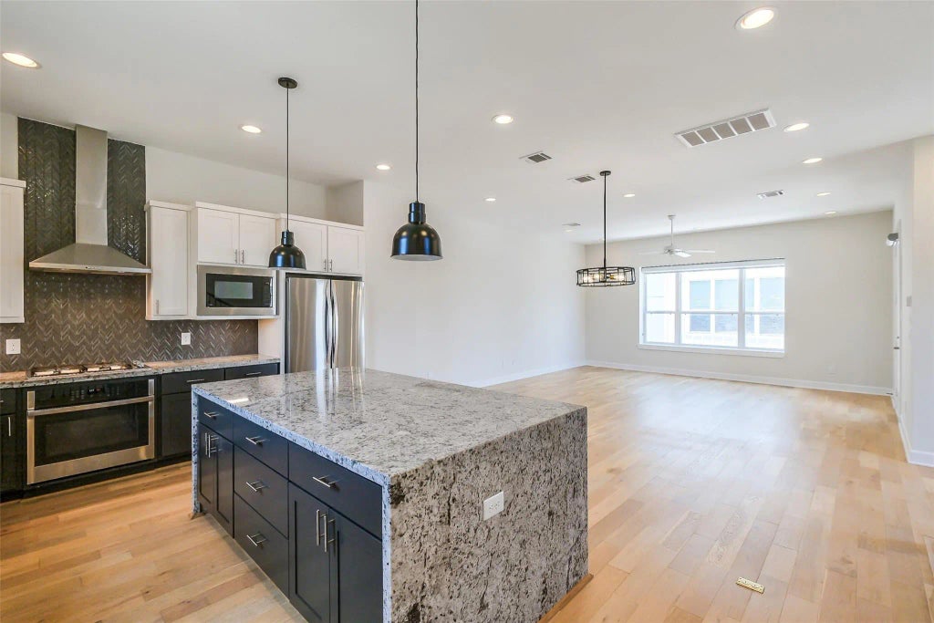 Stunning contemporary style home boasts downtown views, open floor plan, en-suite bathrooms in each room, private yard space, extra parking space, covered balconies & high quality finishes including hardwoods, marble counter-tops, high ceilings, & more! The 1st floor offers lovely tile & a bedroom w/en-suite bathroom - perfect for an office or roommate setup. The 2nd floor features the living/dining areas, half bath & the gourmet kitchen w/waterfall island, breakfast bar, tons of cabinet space, herringbone backsplash, & stainless steel appliances! You'll find the utility room & 2 bedroom suites on the 3rd floor including the primary bedroom suite which has a private balcony, dual vanities in bathroom, walk-in closet & luxurious shower featuring floor to ceiling tile & dual shower heads! Enjoy easy access to downtown attractions, bike trails, restaurants, shopping, parks, & more! Home includes all appliances. Zoned to highly rated Crockett elementary! In-town living at it's finest!