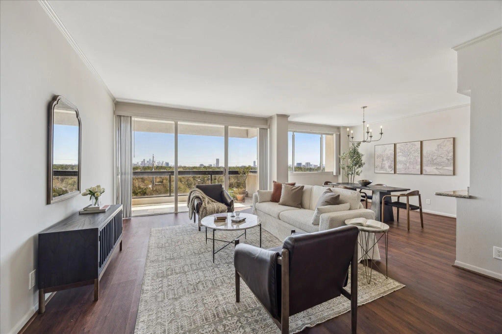 Welcome to one of the best views you could wish for in Houston! This wonderful 10th-floor residence offers gorgeous sunrise views overlooking Memorial Park and downtown Houston daily. Enjoy the magical scenery from your spacious private balcony while sipping on your money coffee. The floor to ceiling windows facing the East, let in plenty of welcoming natural light. Newly Painted, this spacious 1740 sq ft condo has 2 bedrooms, 2 baths, features an open concept living area, updated kitchen and appliances, and wood flooring throughout. There is built in storage cabinets throughout, closets, utility room, and a generously sized primary suite with an ensuite bath and large walk in closet. Bosch HVAC 3 yrs. Frigidaire refrigerator 2 yrs. Dishwasher 3 yrs. Residents enjoy a full-servie lifestyle with 24-hour concierge, security, tennis/pickleball courts, pool, fire pit, dog run, and even a spa, and a party room. ** Small animals only 20lbs or less. Schedule your tour today!