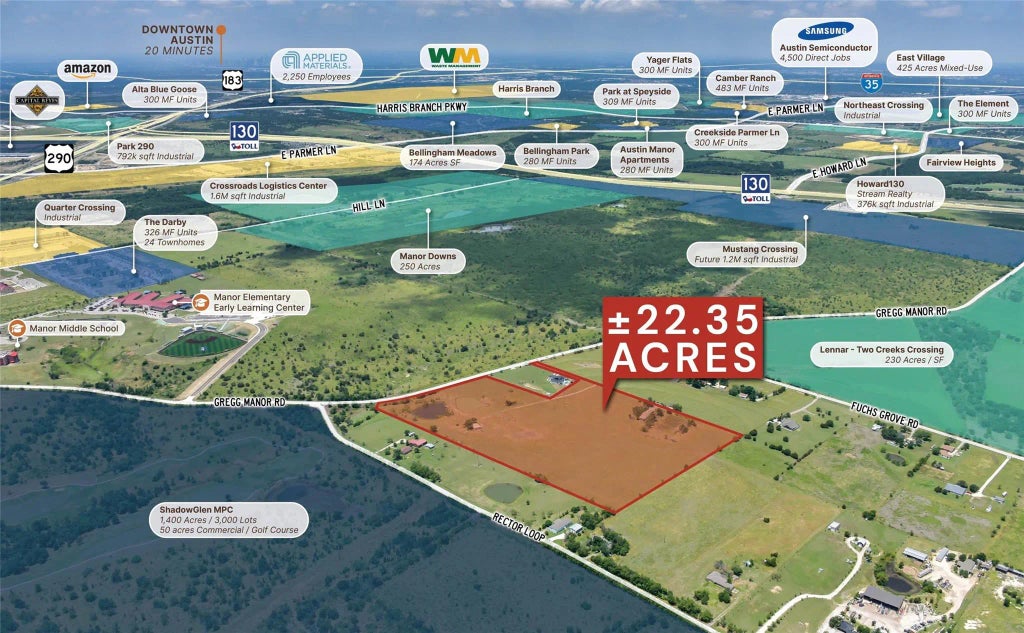 Prime ±22.35-acre development tract at the northeast corner of Gregg Manor Rd & Rector Loop in the Manor ETJ. This tract offers excellent visibility and access, situated less than 1 mile from both US-290 and TX-130. The property benefits from a 16” Manville water line on Gregg Manor & Fuchs Grove Road and will require an off-site wastewater extension by the developer. Positioned near major residential developments, schools, and employment hubs, this site is ideal for multifamily, build-for-rent, industrial or mixed-use development. No zoning restrictions due to its ETJ location. Quick access to Downtown Austin, Tesla Giga Texas, Austin-Bergstrom International Airport, and Samsung Austin Semiconductor Facility.
