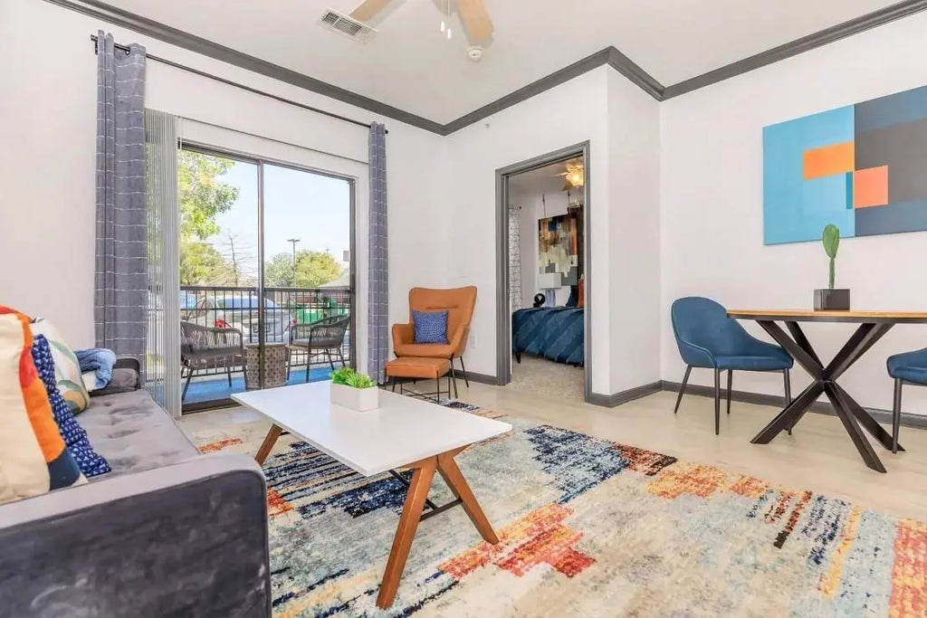 The community offers a range of amenities, including a lounge with Wi-Fi access, a leisure pool with cabanas and a sun deck, and covered parking with detached garages available. There are also nearby public parks, a fitness center, a spacious bark park, and an indoor basketball court. Amenities include 2-inch faux wood blinds, a breakfast bar, and Texas-sized walk-in closets. Additionally, the community features 9ft ceilings with crown molding, designer two-tone paint, and luxurious vinyl plank flooring. For added convenience, there’s additional patio storage and a gourmet kitchen, with some units offering attached garages.
