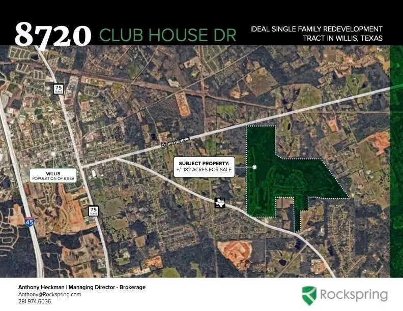 Introducing 8720 CLUB HOUSE DR, a prime 182-acre redevelopment opportunity in Willis, Texas. Nestled in bustling Montgomery County, just an hour from Houston, this former golf course tract is tailor-made for a luxurious single-family residential community. Boasting 223 lots within the acclaimed Willis School District, the property is strategically located with two entrances off County Line Road and FM 2432 for convenient access. The area's average household income of $102,300 within a five-mile radius underscores the lucrative demographic. With the local market supporting homes from $250k to $450k, this site presents a promising investment in a rapidly growing region enriched with local amenities and services. Don't miss this unparalleled opportunity for an exclusive residential development at 8720 CLUB HOUSE DR! **HAS 10+ Million in approved MUD Bonds**
