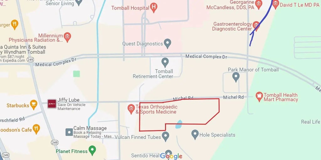 10.1524 ACRES in the heart of the Tomball Medical District. Ideal for medical specialty hospital, medical rehabilitation facility, nursing facility, medical office condos, retail development. Located adjacent to Texas Orthopedic & Sports Medicine Hospital. Approximately 1,115' of frontage on Michel Rd. Mostly wooded. Utilities available. Curb cuts in place.