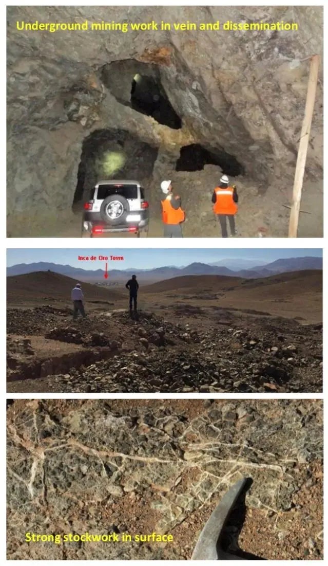 The Inca Auriferous Project is located in Region III of Chile, 105 km north of Copia|pó city, and 104 km SW of Chañaral port. And 850 km north of Santiago. Closer is Inca de Oro, a small mining town (4 km to NE). Paved road and railroad 1 km away. Easy access to water and energy through nearby high voltage line and proximity to water wells. Mining friendly district, without relevant environmental and community problems. The area contains epithermal style alteration (low-intermedial sulphidation), with mineralization of gold and minor silver and copper. Metallogenetically the project is located in the coastal belt, very near to new discoveries at Inca de Oro and Carmen Porphyry Copper (PANAUST-CODELCO, 345Mt@0.47% Cu) located 2km NE.