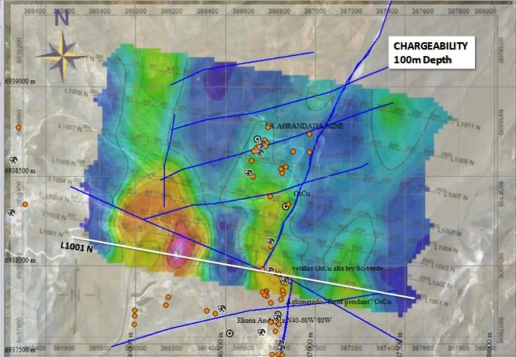 Agrandada Project is located in Region III of Chile. It is located, in a straight line 30 km SE of Copiapó City, and 20 km SE of Candelaria Mine (Lundin Mining). And 75 km NE of Desierto de Atacama Airport. The area contains strong evidences on mineralization, lithology and alteration can classified this ore deposits as Porphyry Copper Cu – Mo – Au style. Metallogenetically the project is located in the Paleocene Porphyry Cu belt, and near 20 km to the west with IOCG belt (Candelaria Mine and Punta el Cobre Belt). So far the exploitation of oxidized copper ores has been carried out in several small mining works and tunnels with grades that fluctuate around 1.5 to 2.5 percent copper. Molybdenum anomalies higher than 70 ppm were found on average.